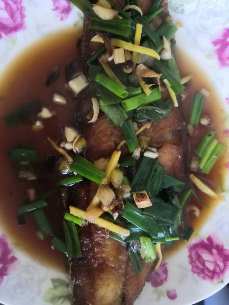 4:大葱切段平铺在盘中,鱼段平铺在大葱上