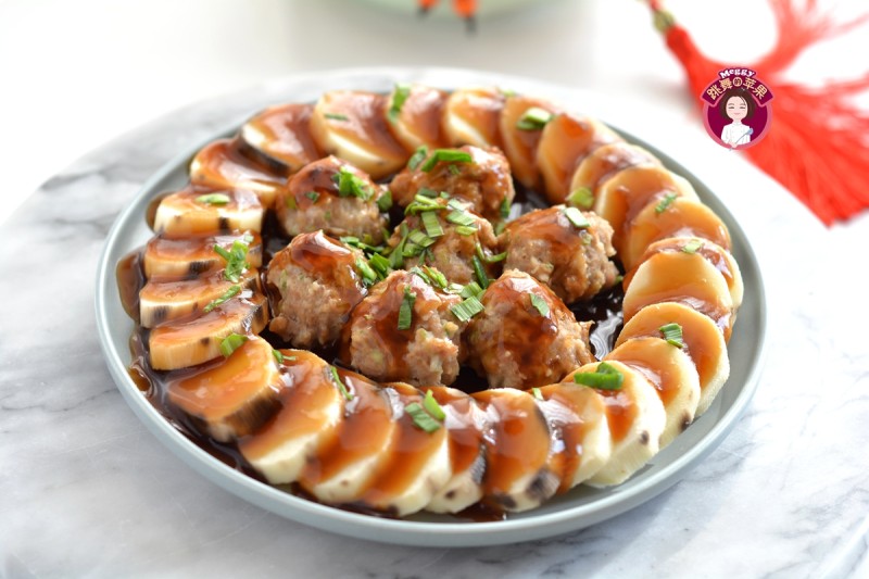 12:蒸好的山药肉丸立即出锅,将芡汁淋在山药片和肉丸上,再撒少许青蒜叶或者香葱末,香气扑鼻,肉丸结实入味解馋,山药片软糯自带微甜,无油少盐的一道“蒸蒸日上”,男女老少皆适宜,尤其更受讲究养生的老年人喜爱。