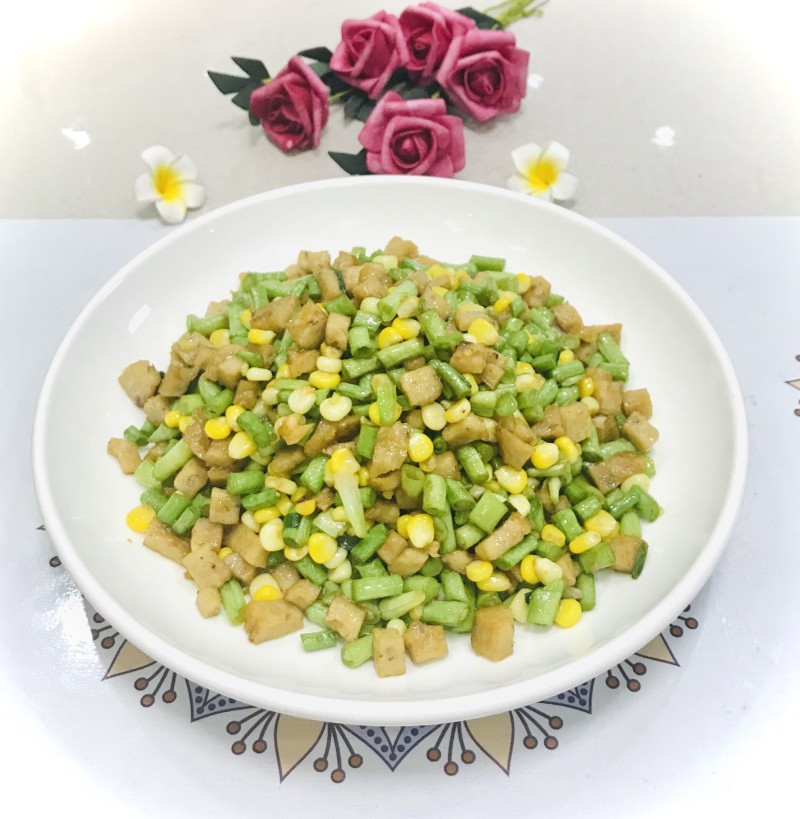 6:再倒入炒好的玉米、豇豆炒一两分钟,加适量食盐调味。