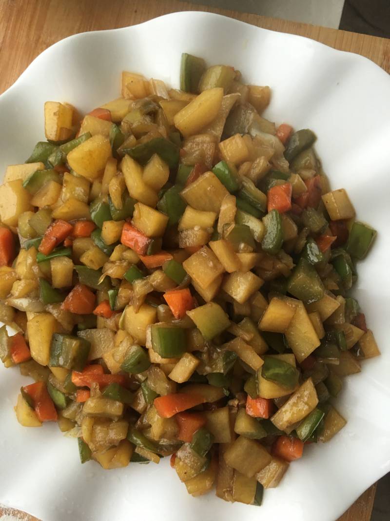 6:土豆煮绵软后加入黄瓜和洋葱,再加一勺生抽,大火收汁即可。
