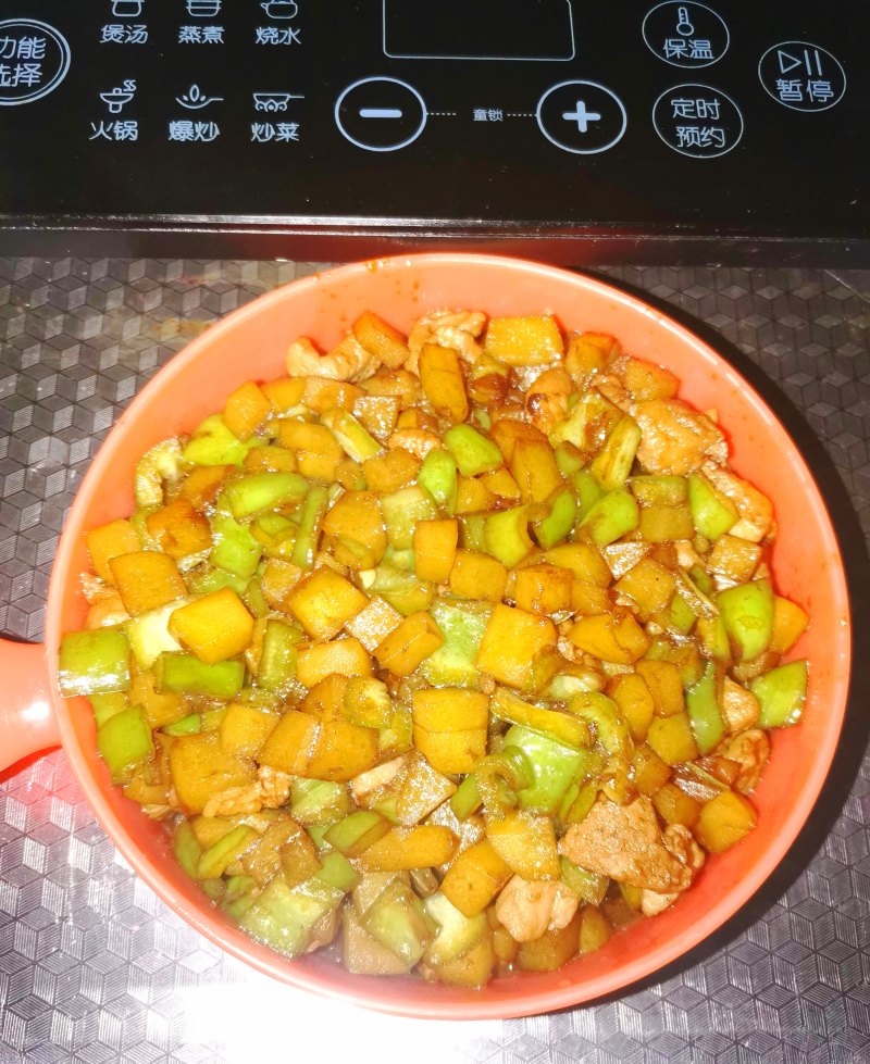 4:倒入炒好的肉丁及青椒丁煸炒断生。