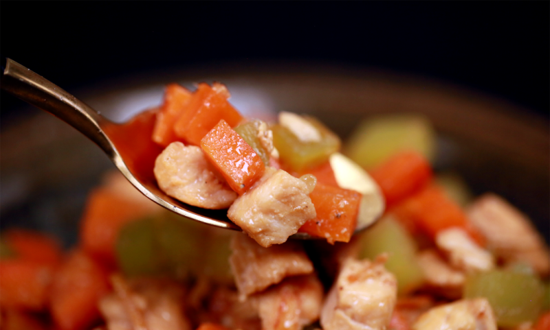 2:鸡胸肉表面切花刀,然后切成跟青笋和胡萝卜大小的丁。