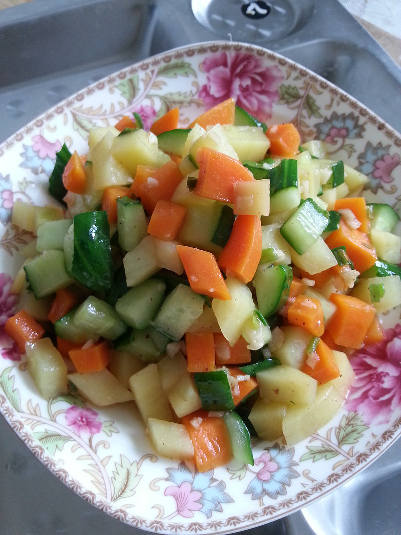 1:原料:胡萝卜、黄瓜、土豆、蒜瓣、葱。