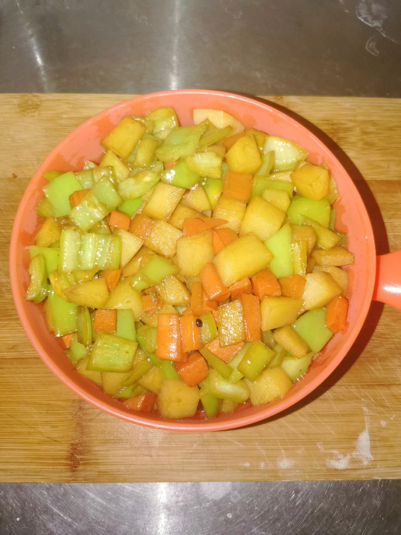 1:杏鲍菇,胡萝卜,菜椒切丁,切好蒜末。