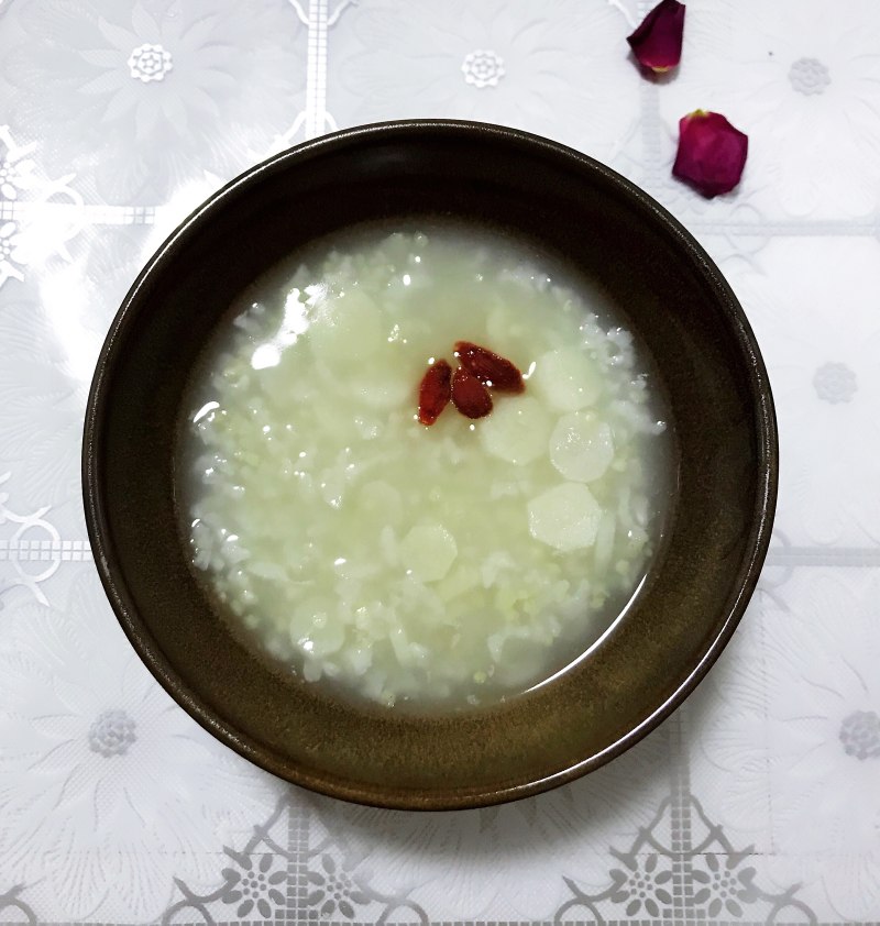 用水量可根据自己喜好酌情调整。此粥为体质人群食谱,大便秘结者慎用。若无电炖锅,也可以将各材料泡发后用炉火直接熬煮。
