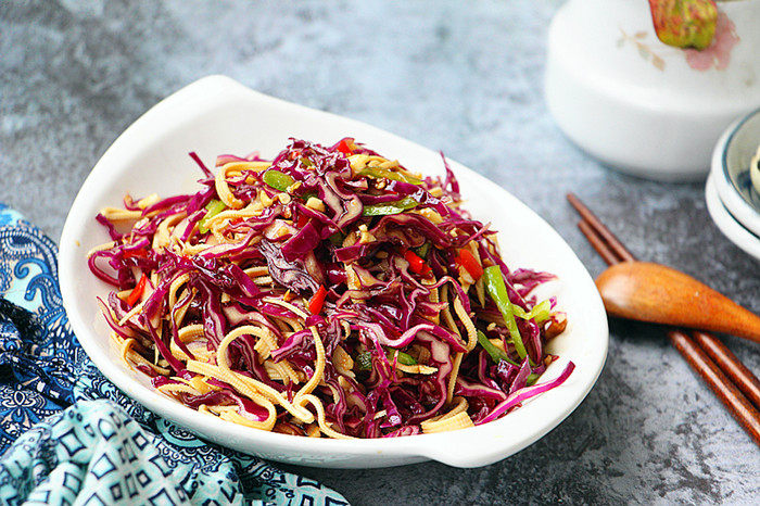2:豆皮、紫甘蓝、尖椒分别切细丝,大蒜切末备用。