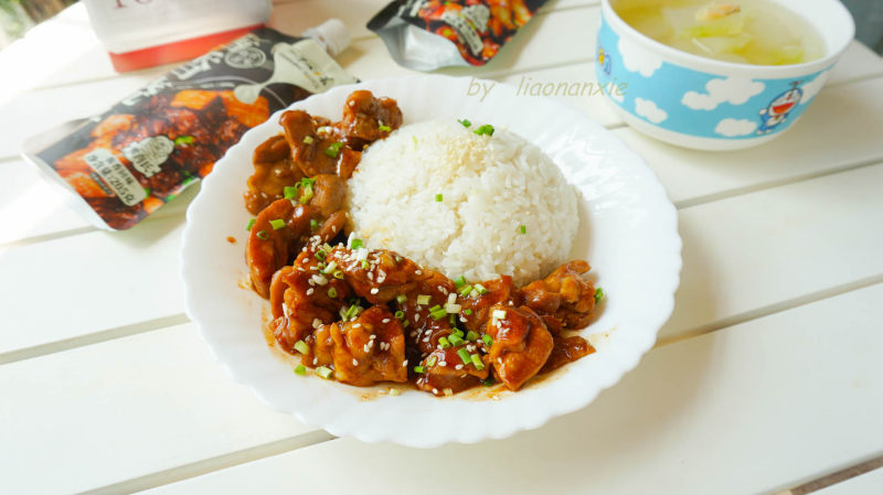 7:组合上桌,蒸好的米饭装盘,盛上烧好的鸡块,放一点儿炒熟的芝麻和小葱碎,上桌就可以开吃了。这顿饭除了鸡腿饭之外,还用冬瓜和虾皮煮了一锅汤,简单又好吃。