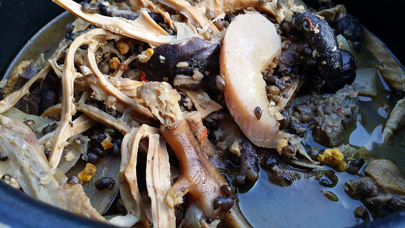 1:干笋绿豆适量用水泡发,鸭肉汆水(因为一个人手忙脚乱实在顾不上拍照啦)
