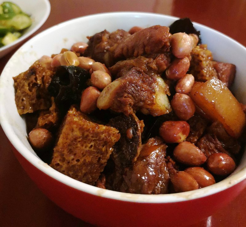 11:加入适量盐、白糖、生抽、老抽,适量水,花生米烧开
