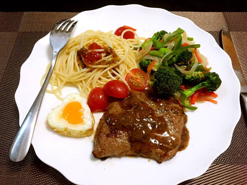 5:将盘子里摆入牛排和煎蛋,在四周放上花菜或生菜菜,西红柿和黄瓜片,将煮熟的意面摆上并挤上番茄沙司即可。依个人口味,玉米等辅料。