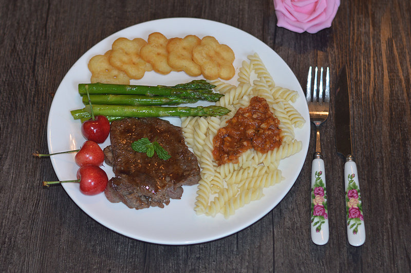 菲力牛排适量;芦笋适量;意面适量;