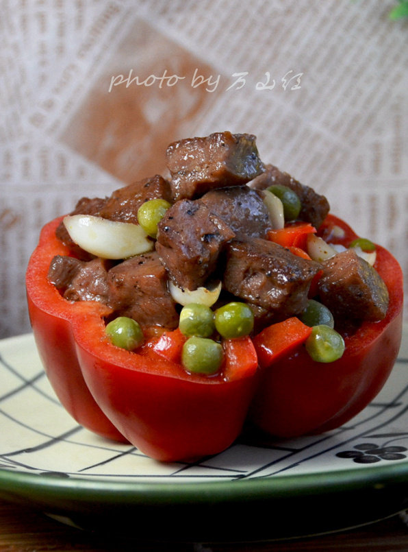 菲力牛排150g;百合70g;熟豌豆30g;红甜椒1个;