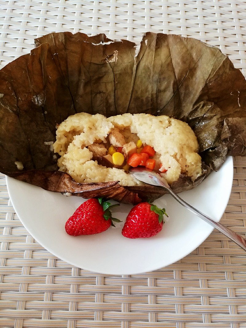 大家也可以将这量做成10个小的荷香糯米鸡,那样当早餐吃量就正好。我是做午餐吃,所以做的较大个,一人一个省事啦!
