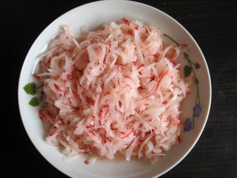 4:用手将白萝卜和白糖抓匀。