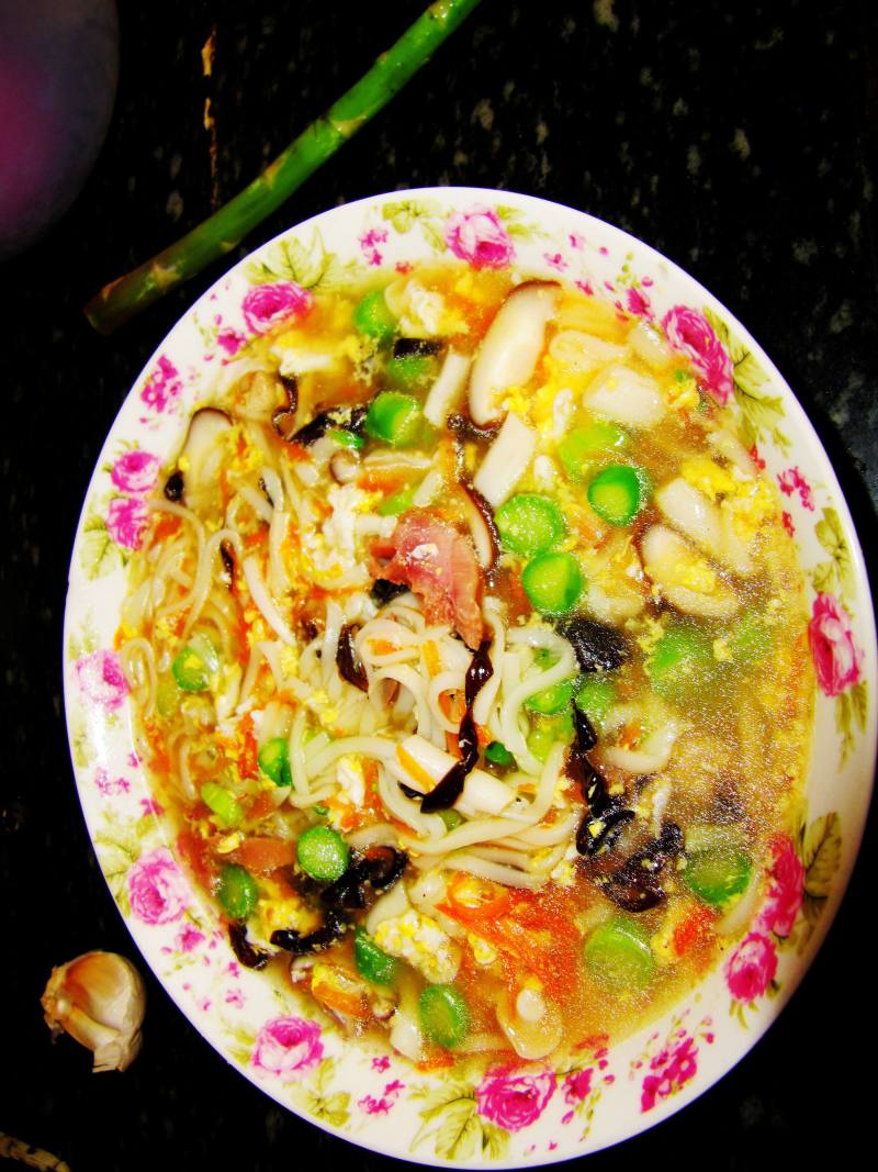 胡萝卜20g;木耳20g;熟肉20g;鸡蛋1个;海鲜菇30g;香菇2个;芦笋2根;挂面100g;