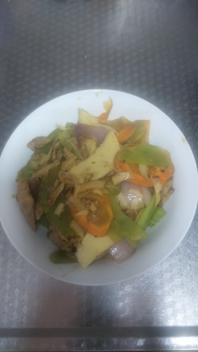 4:再把剩余的食材放到锅里一起炒熟加点酱油。