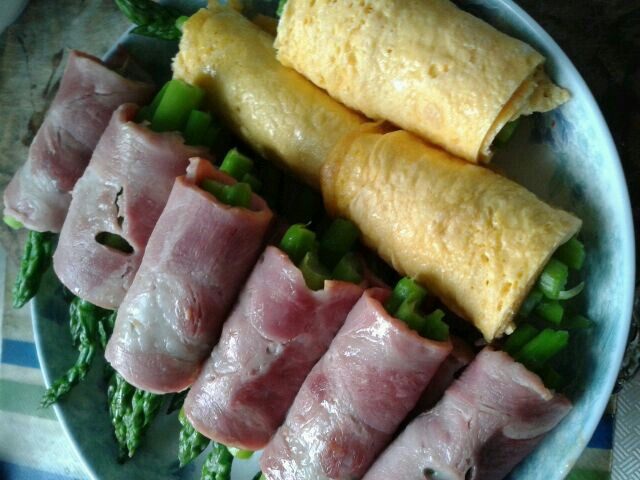 9:蛋皮条卷起芦笋段,和培根卷放在一起,双色芦笋卷就好了。