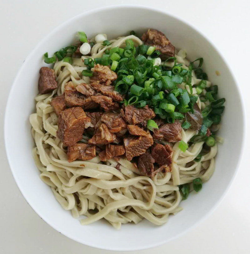 4:把牛肉加工成卤;待面醒好,烧水,将面擀开,切成宽厚一般的面条;