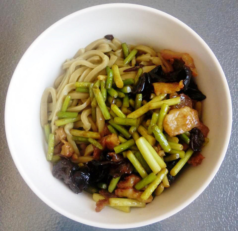 3:放瘦肉末、青菜、番茄或者是一些腌制的菜炒,这些按自己喜好搭配。把配菜炒一下放盐,然后把面条放进去翻炒几下就好了