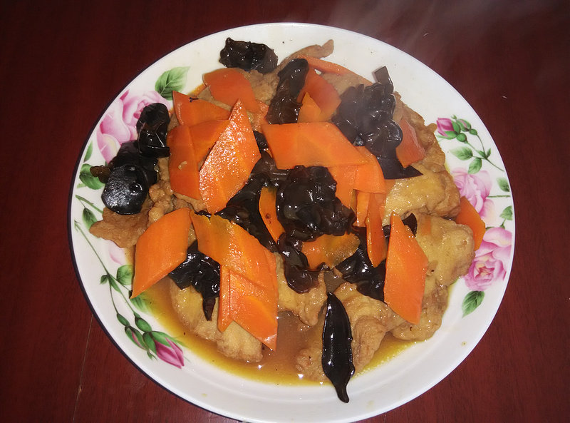 13:胡萝卜炒软后,放入木耳继续煸炒。