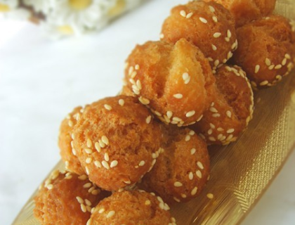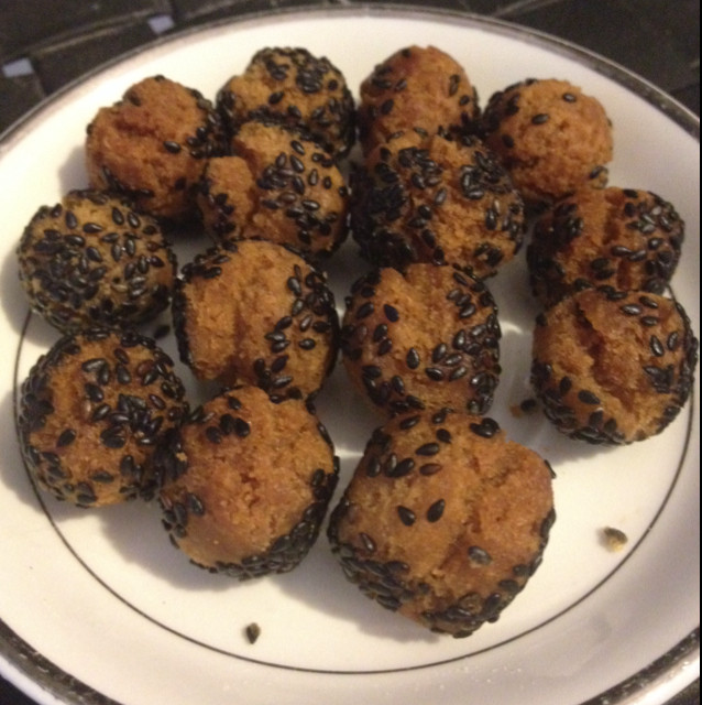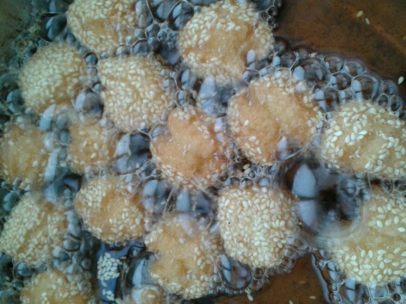 9:锅中放油,100℃左右放入沾满芝麻的圆球进行炸制,全程小火,否则容易炸不透