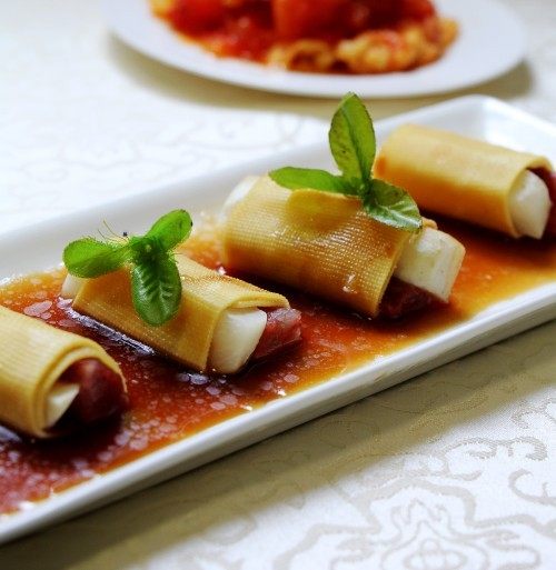 5:拿一根山药条和一根腊肠条组成一组,用百叶皮包卷起来。