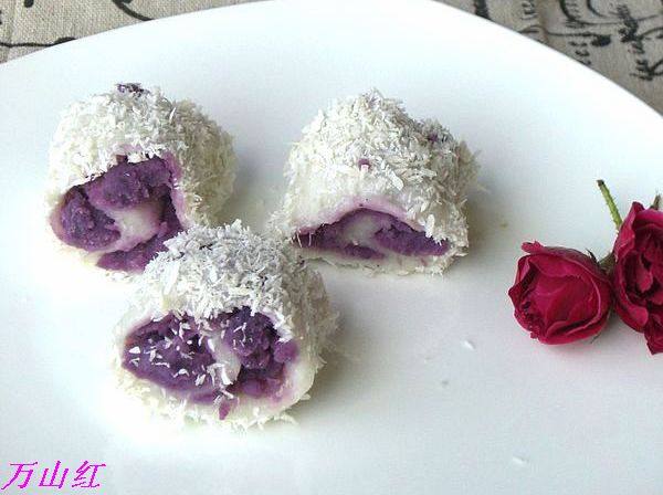 2:紫薯去皮碾压成泥,加适量的糖和黄油搅拌成馅
