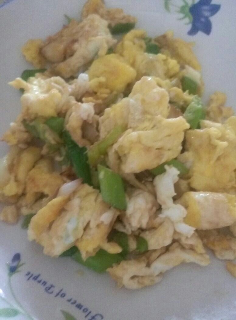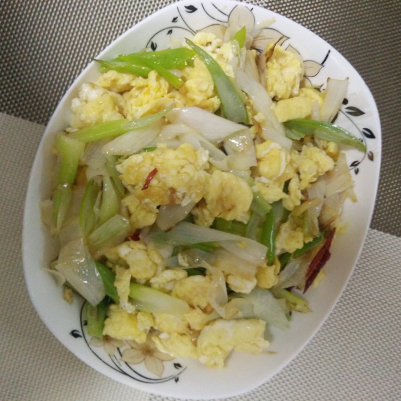 3:锅中放油烧热,放入大葱,炒熟。锅中倒入鸡蛋,一面凝固,翻面,全部炒熟。放适量十三香,盐。出锅。