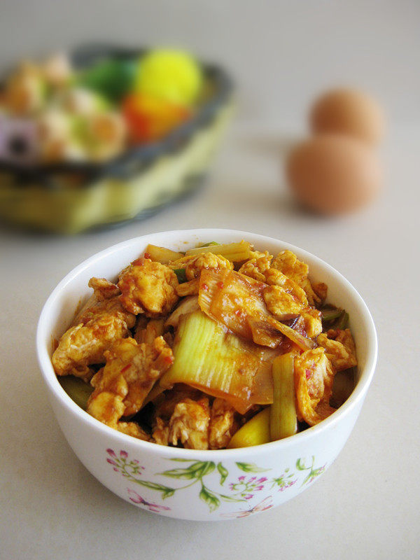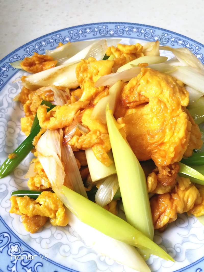 4:另起油锅,加入大葱翻炒出葱香味,下入煎好的鸡蛋翻炒。