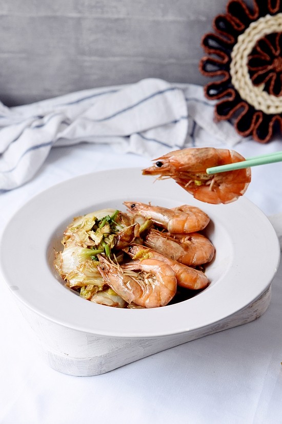 海虾6只;娃娃菜1棵;姜2片;葱1段;