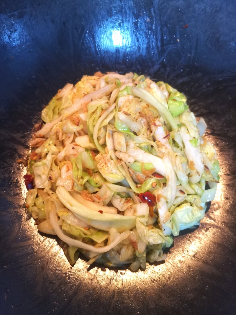 6:加入撕好的白菜帮,保持大火爆炒。锅中要勤翻快翻。如果您的菜帮不出水,可以沿锅边淋一点,新鲜的大白菜是不用淋的。