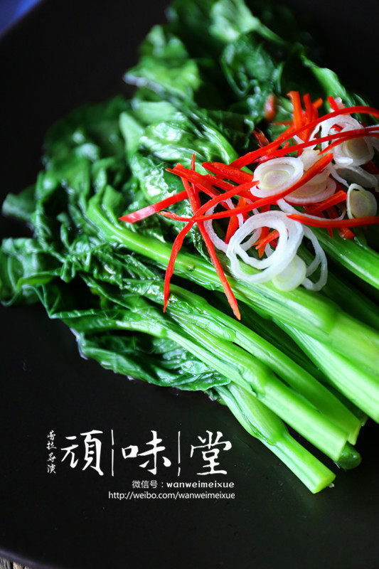 芥蓝菜心200g;红椒丝少许;葱白丝少许;