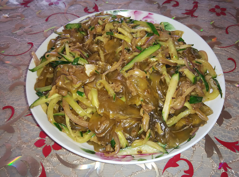 1:拉皮洗净,切成条。
