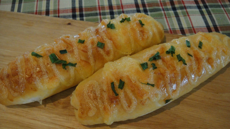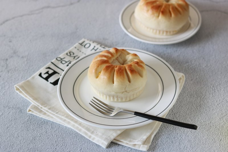 4:发酵结束表面刷蛋液撒芝士,再挤上沙拉酱,入预热好180度烤箱,中层20分钟上色即可,出炉后再撒少许干葱。