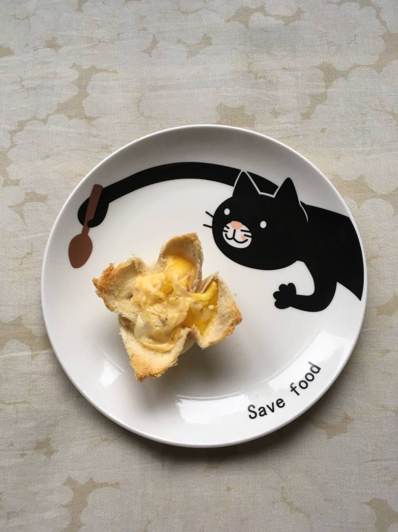 4:将吐司片儿,折成杯子状,放在马芬模具中,备用。烤箱170度,先预热五分钟。