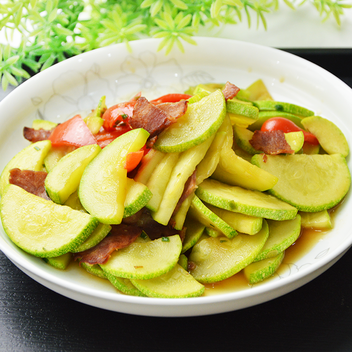 西葫芦250g;培根100g;油适量;盐适量;糖适量;鸡精适量;