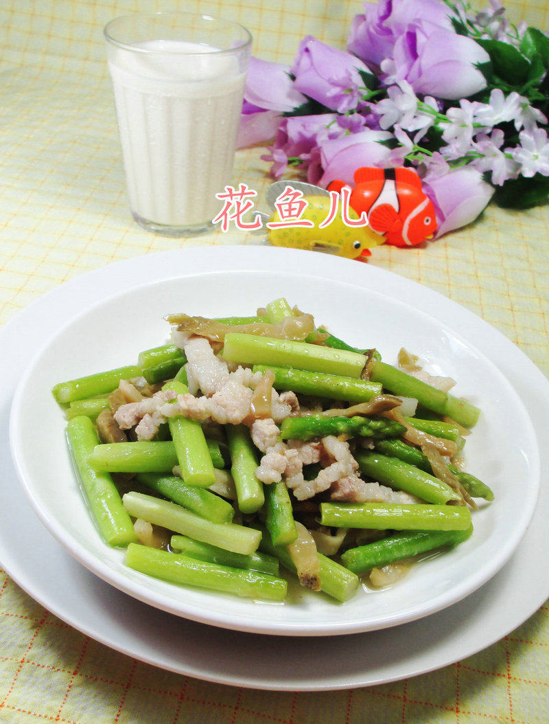 6:然后,合入榨菜丝和焯好的芦笋翻炒一下。