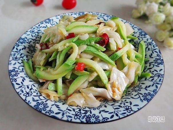6:下入西葫芦片,大蒜头、米椒翻炒断生。