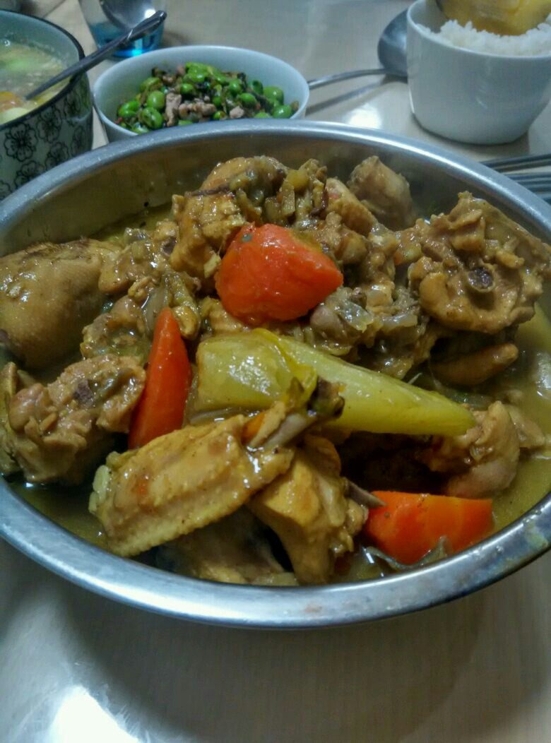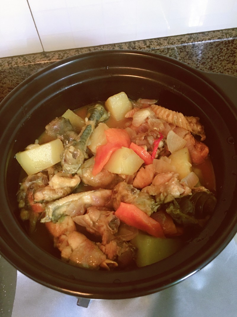 2:热锅下凉油,油热下蒜,姜,洋葱,爆香下鸡块,翻炒后下所有蔬菜,加水至覆盖食材,放少糖,咖喱粉 生抽 水拌匀加入,少量盐,少量牛奶,开炖,大火滚开后调中小火;水不多时大火收汁,注意翻炒防止粘锅底。