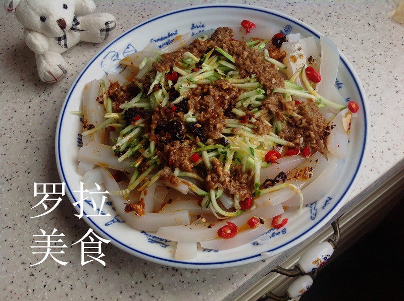 9:黄瓜擦丝,淋上搅拌好的调料红油即可。