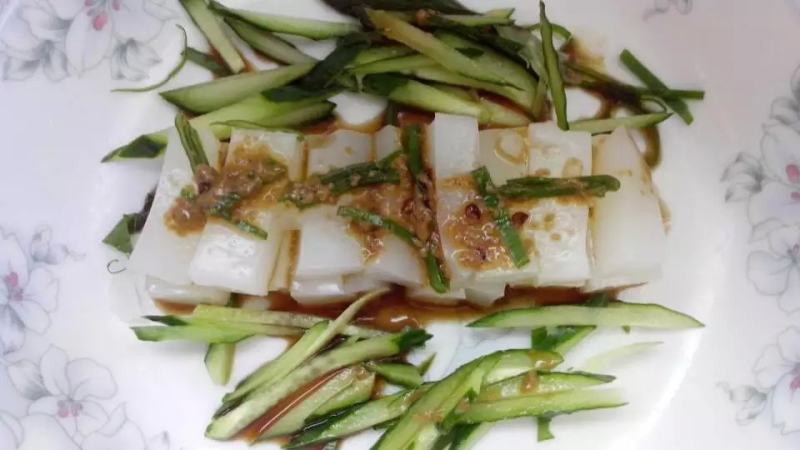 6:将料汁浇在凉粉上即可。