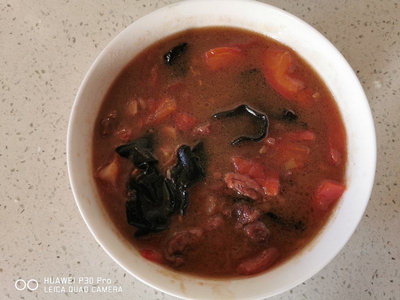 4:然后加入黑木耳,再炖15分钟,出锅前5分钟,加入西红柿!