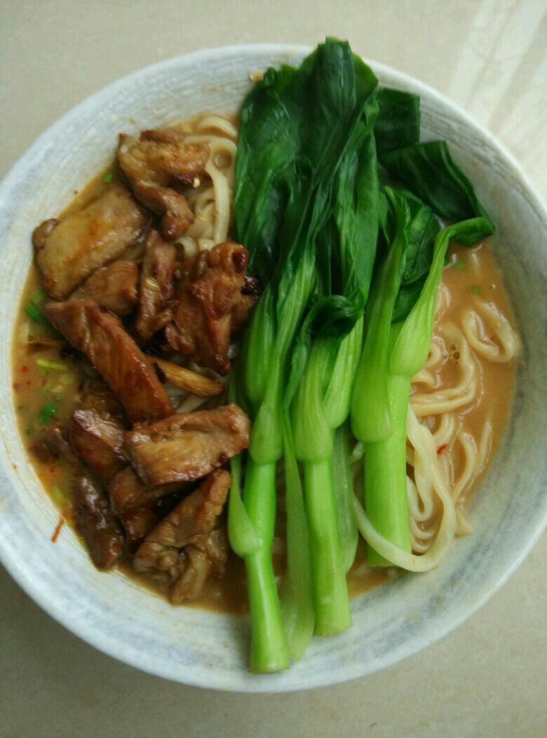 4:面煮开捞出放入调好的醤碗中,另外倒入热开水搅拌下(不要用煮面水,颜色会混沌),放入青菜和炒肉,吃啰!