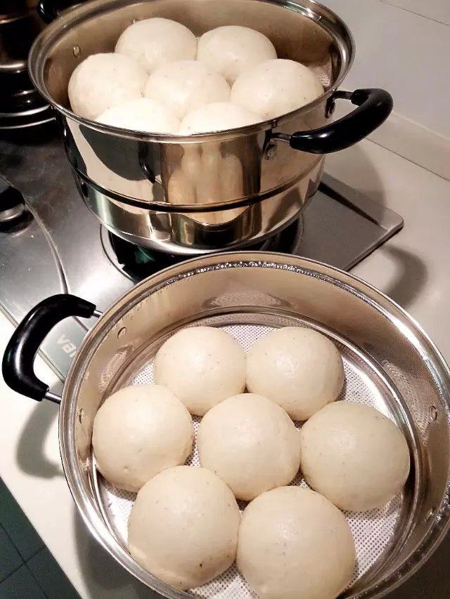 5:搓圆所有面团,放入温水蒸锅中(冬天放开水蒸锅中),便于二次发酵。二次发酵至2倍大时(夏天半少时左右)。