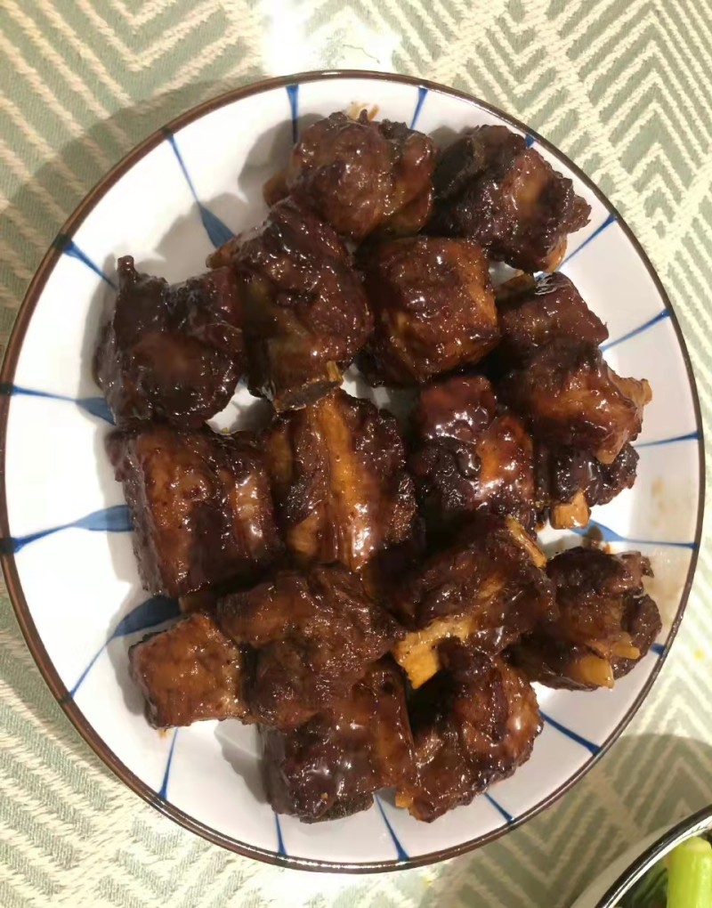 3:排骨煮至软硬适中时,放入冰糖和适量盐调味,待汤汁逐步起稠变浓时再加入1勺陈醋,收汁到想要的程度熄火出锅。