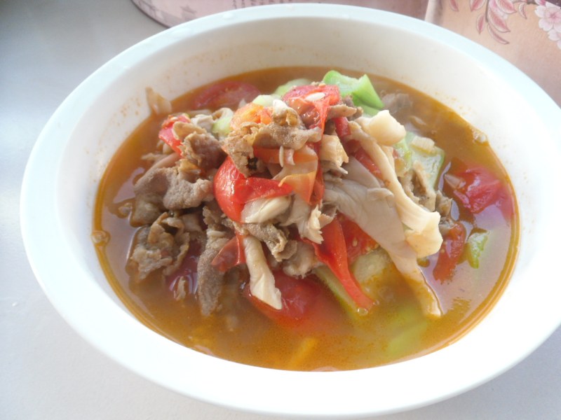 羊肉片200克;丝瓜1根;西红柿1个;鲜蘑200克;