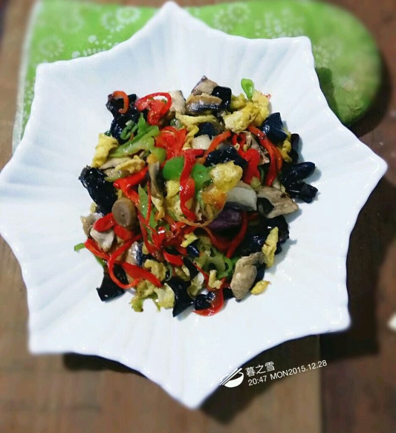 8:加入口蘑和耳子炒熟加盐鸡精出锅。