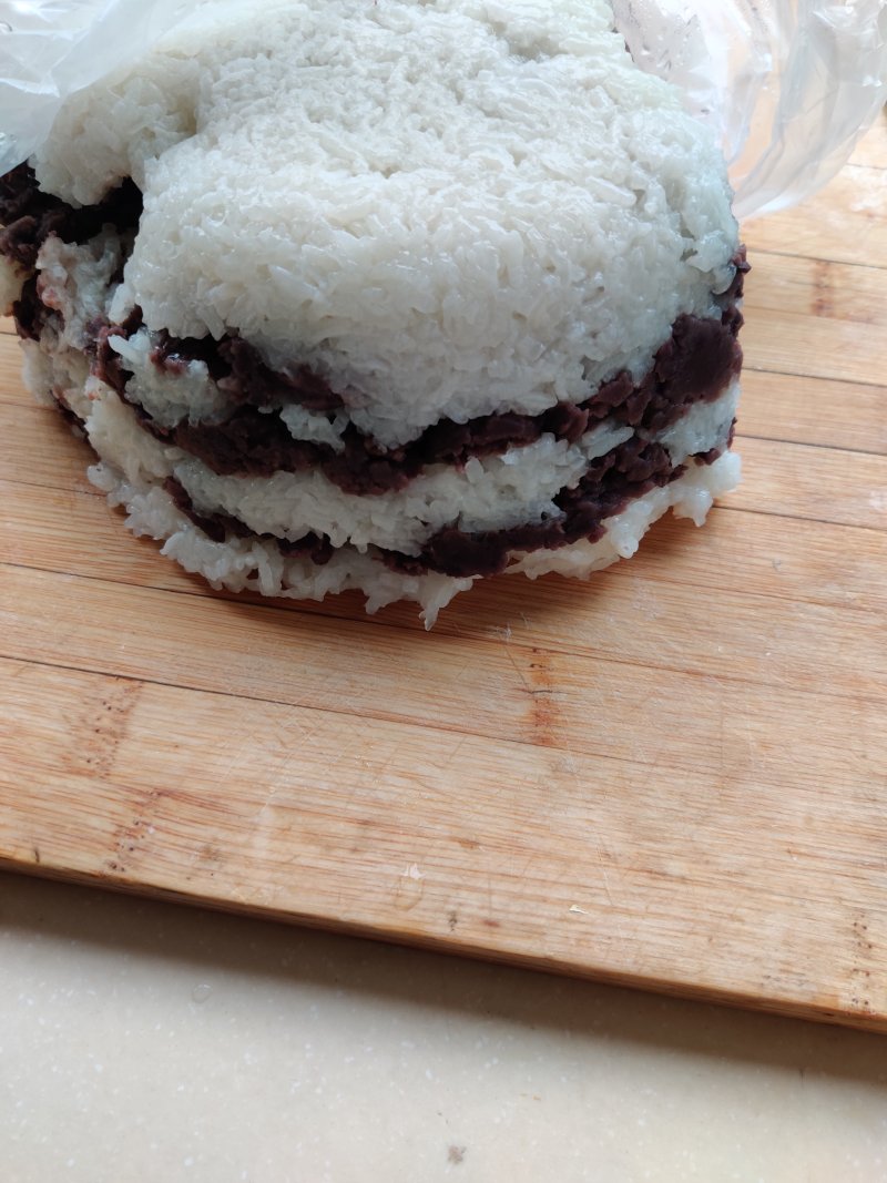 3:炒豆馅儿忘了拍照了,这里说一下吧:把呲熟变软的红小豆盛出备用,不粘锅里放一小块儿黄油,把豆馅儿放进去,根据自己的口味分次加入糖,不停的翻炒,大概二十分钟左右,豆馅儿就做好了。这时江米也蒸好了,找一个大小合适的盆儿,一层江米,一层豆馅儿的码放进去,晾凉就行啦。记得赶上点,要不最上面一层江米会干的。