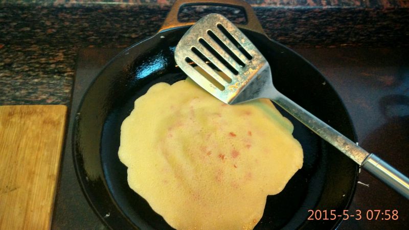 3:不粘锅加油,加热,倒入面糊,稍稍凝固,翻面