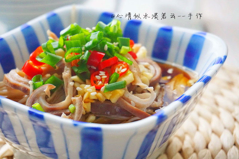 2:准备所需原材料,猪肚事先煮熟冷却后切成细丝(煮猪肚的高汤备用)